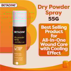 BETADINE Dry Powder Spray 55g is an antiseptic powder designed to treat and prevent infections in wounds, cuts, and burns. It contains povidone-iodine, which is known for its broad-spectrum antimicrobial activity. The spray format ensures easy application to the affected area without touching the wound directly, promoting faster healing and cleanliness.